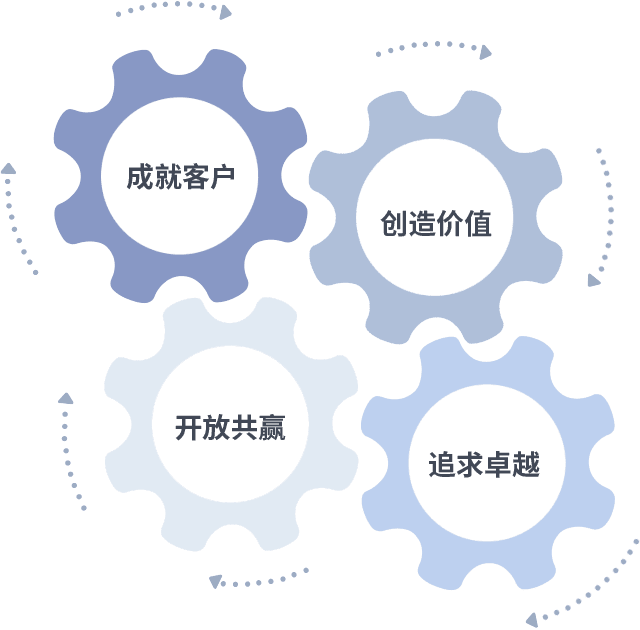 成就客户是一切决策的出发点,,创造价值是衡量所有工作的标准,,,,追求卓越是我们做事做人的态度,,开放共赢是我们的格局也是最终的结果。。。价值观的齿轮环环相扣,,,推动着组织里的每个人不断向前。。
